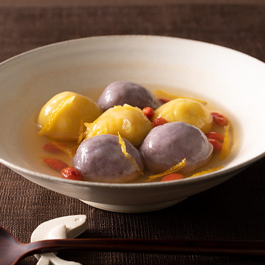 色も香りも楽しめる!「彩り豆腐白玉 ごまとゆずの香り」