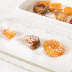 ドライフルーツはアルコール分を飛ばしたひたひたのラム酒にあらかじめつけて1週間ほど置いておく。汁気を切って大きいものは半分に切り分け、グラニュ糖をうすくまぶして並べる。
