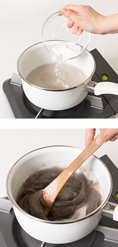 本わらび粉に水を少しずつ加え、粉の塊を指でつぶしながら溶かす。溶けたら鍋の上にざるを置いて漉し入れる。上白糖を加え、中火にかけて焦がさないように、木べらの面を鍋肌に沿わせるように混ぜながら煮る。最初はサラサラだがだんだんつやが出て半透明になると、強い粘りが出始める。木べらをしっかり握って大きな円を描くように勢いよく混ぜる。