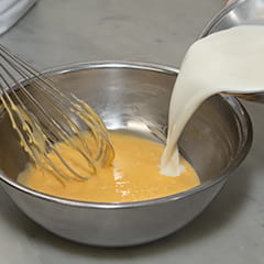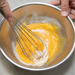 割卵してほぐした卵に、グラニュ糖と薄力粉、塩を入れてよく混ぜ合わせる。