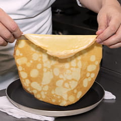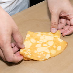テフロン加工のフライパンを温めて、クレープ生地を流し入れて片面焼く。火が通り、生地の縁が乾いて浮き上がってきたらひっくり返してもう片面を焼く。