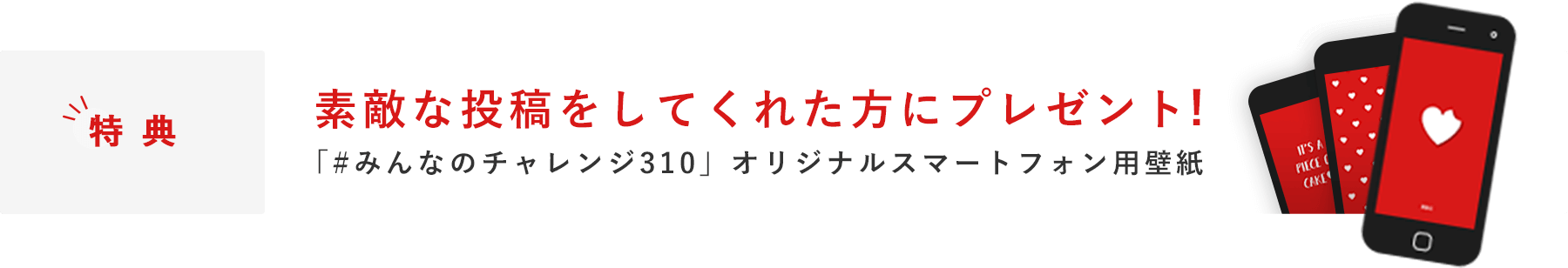 自分が、もしくは第三者の誰かが「新しいことにチャレンジしている動画・写真」を撮影し、ハッシュタグ「#みんなのチャレンジ310」とコメントを付けて、Twitterで投稿してください♪
