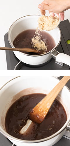 鍋に水と寒天を入れてよく混ぜ、中火にかける。煮立ったら弱火にして2分ほど煮て、こしあんと三温糖を混ぜてよく混ぜながらもったりするまで加熱する。混ぜるときに鍋底が見えるようになったら、ラム酒を混ぜてひと煮立ちさせ、火からおろす。