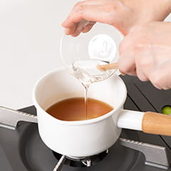生姜風味ソースを作る。小鍋に三温糖と水を入れて、中火にかける。5分ほど煮込んで、すりおろした生姜を絞った汁と水あめを加え、シナモンパウダーも手早く混ぜる。さらに2~3分煮込んで火を止め、冷ます。