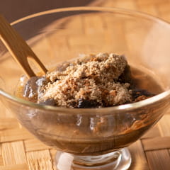 水気を切ったらきな粉と三温糖を混ぜたものを入れたグラスなどの器に盛り、生姜風味ソースをかけ、さらにきな粉と三温糖をふってできあがり!