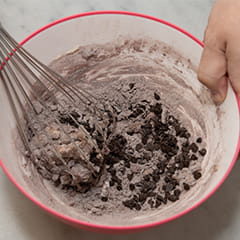 ふるっておいた粉類を加えてさらに混ぜる。チョコチップを加えてさらに混ぜる。