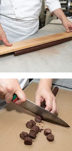 生地が均一な状態になったら棒状に成型して、冷蔵庫で10分程度休ませ、好みの厚さにカットする。