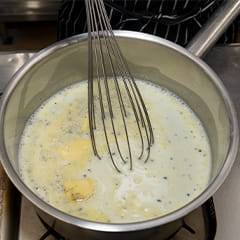牛乳、バター、グラニュ糖、バニラペーストを鍋に入れ、泡立て器でかき混ぜながら加熱し、沸かして冷やしておく。