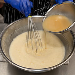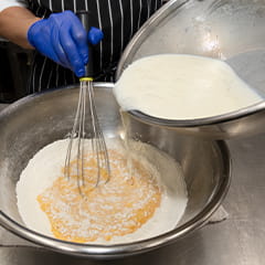 1に薄力粉と合わせた卵を加え、冷やした牛乳を注ぎながらゆっくり中心から混ぜていく。