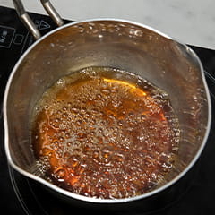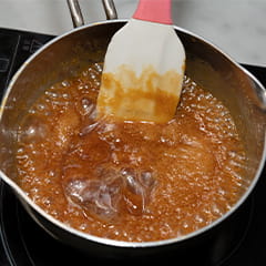 鍋に水あめ、グラニュ糖を入れてキャラメルになるまで焦がす。
