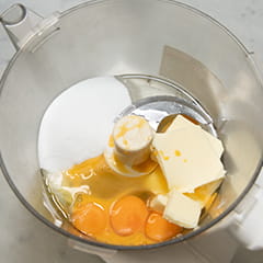 バター、サラダ油、グラニュ糖、全卵をフードプロッセッサーに入れて混ぜ合わせる。