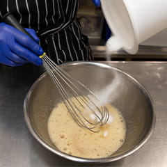 卵をほぐして、ハチミツ、グラニュ糖、薄力粉とベーキングパウダーを合わせてふるったものを加え、その都度よく混ぜ合わせる。