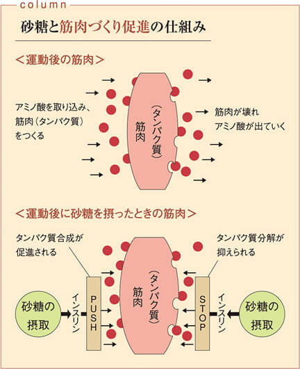 また、運動直後にお砂糖を摂ると、ブドウ糖を細胞内に取り込ませる働きのあるインスリンの働きが高まります。